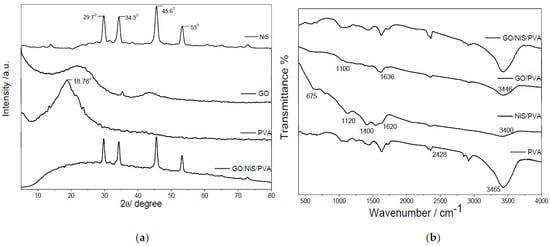 The nanocomposite film preparation was as follows: A clear solution was obtained by dissolving PVA (99% hydrolysis, medium MW, Sig-ma-Aldrich, St. Louis, MO, USA) in water at 90 °C for 2 h with vigorous stirring. This resulted in the preparation of a 10 wt.% PVA solution. A suspension of GO and NiS (1:1 wt.%) in a few drops of water was added to the semisolid PVA film, and the polymeric solution was crosslinked by adding 0.5 mL of glutaraldehyde (GA) (50 wt.% in H2O, Alfa Aesar, Tewksbury, MA, USA) in 10 mL of acetone and stirring thoroughly for 4 h at 40 °C. The coated film was dried in a vacuum oven at 60 °C for the entire night after the GO and NiS suspension were added to the semisolid PVA film.