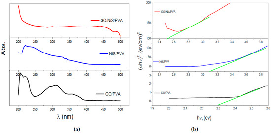 The UV–Vis absorbance analysis was conducted, and the results are depicted in Figure 2a. The highest level of absorption was observed between 200 and 400 nm. As a result, the produced coated films may have a strong UV and visible activity. However, Equation (2) illustrates the determination of the optical band gap of films coated with GO/PVA, NiS/PVA, and GO/NIS/PVA through UV–Vis absorbance using Tauc’s equation [32]