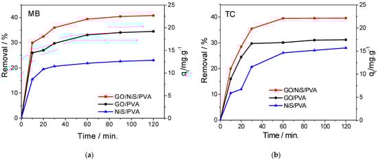 where Co and Ct are the initial and concentration at time (t), respectively, of MB and TC, V is the volume of solution per liter, and m is the mass of coated film’ strips per gram. Based on a comparative analysis of the removal efficacy of the tested films, the following order was determined: GO/NiS/PVA > GO/PVA > NiS/PVA. These results indicate that the presence of GO nanoparticles with NiS nanoparticles on the film’s surface plays a significant role in enhancing the adsorption of MB and TC. This suggests that the heterostructures present in the coated film contribute to the improved MB absorptivity and TC on the film’s surface [34]. Moreover, it is widely recognized that GO sheets can form various bonds and interactions due to the presence of ionic groups and aromatic sp2 domains. Therefore, the formation of electrostatic interactions between MB or TC molecules and aromatic regions of the GO in the coated film can enhance the physical adsorption of MB or TC molecules [35].