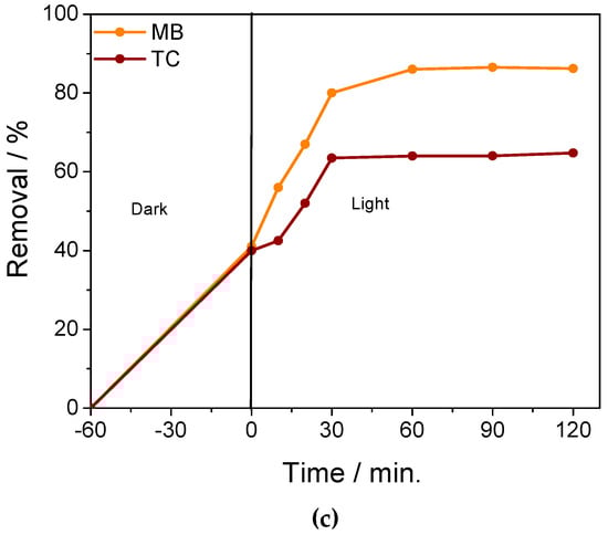 (a,b) represent the adsorption process in the dark, and (c) represents the removal rate for the whole removal process of MB and TC on prepared GO/NiS/PVA-coated films.
