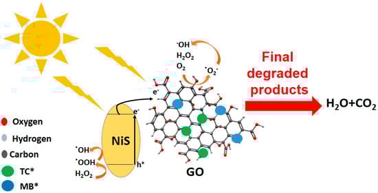 The mechanism underlying the photocatalytic degradation of MB and TC molecules on the surface of a film coated with GO/NiS/PVA is depicted in Figure 5. Upon exposure to visible light, NiS in the coated film’s conduction band (CB) or stimulated (MB*) or (TC*) molecules might produce electrons. The produced electrons are transferred to GO, therefore inhibiting the charge recombination processes in NiS and enhancing the heterostructure-coated film’s photocatalytic activity [36]. The generation of reactive oxygen species (•O2−) occurs through the reaction between generated electrons on graphene oxide (GO) sheets and absorbed surface O2. This also occurs at NiS surfaces as holes and electrons combine to produce •OH radicals. The (•O2−) and (•OH) radicals act as catalysts for the degradation of MB and TC molecules. In addition to charge separation, pollutants’ adsorption, light absorption, and surface oxygen adsorption can impact the photocatalytic activity of the heterostructured GO/NiS/PVA-coated film.