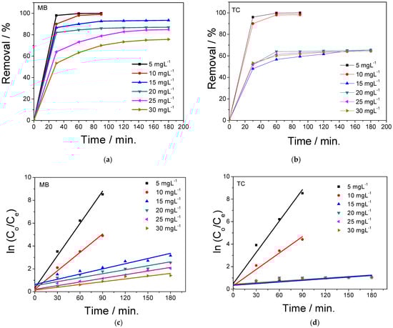 The duration of illumination was measured at different intervals, both in the absence of light and in the presence of light. The experiment involved using 0.02 g of film strips saturated with 50 mL of 20 mg L−1 MB dye or TC antibiotic solutions, with a solution pH of 7. The dark adsorption of MB and TC exhibited a positive correlation with time, as depicted in Figure 4a,b, and subsequently plateaued after 60 min.