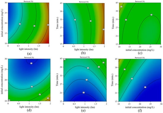 Contour plots of MB (a–c) and TC (d–f) removal (%) on GO/NiS/PVA heterostructure-coated film.