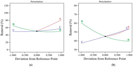 An analysis of variance (ANOVA) was utilized to determine the main effect of each factor and their interaction. The statistical analysis revealed that the observed effects exhibit statistical significance (p < 0.05). These findings suggest that the percentage of MB and TC removal is significantly affected by the variables of light intensity, initial concentration, lumination time, and their combined effect. The contour plots shown in Figure 7 indicate a direct relationship between light intensity and removal percentage. In contrast, the fitted surface plots of MB and TC removal % demonstrate a negative correlation between the initial pollutant concentration and the removal percentage. This relationship is contingent upon the combined influence of the initial pollutant concentration and light intensity. Nevertheless, the combined impact of light intensity and lumination time demonstrates a direct correlation with the elimination percentage. Furthermore, it can be observed from the perturbation plot depicted in Figure 8 that as the initial concentrations (variable coded B) increase, there is a corresponding decrease in the removal %. Conversely, it was determined that the degradation process of TC is regulated by the starting concentration, whereas the degradation of MB is primarily influenced by light intensity.