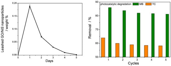 The examination of the reusability of GO/NiS/PVA-coated film, as shown in Figure 9b, revealed that the process is cost-effective. The GO/NiS/PVA film strips were recovered, cleaned in 0.1 M HCl solution, and used five times under ideal circumstances. The film’s strips were repeatedly cleaned with a 70% (v/v) ethanol aqueous solution until TC and MB were removed from the solution. According to the results, efficiency decreases for both TC and MB, decreasing from 64% to 58% and 86% to 81%, respectively. The fouling of the porous surface, the leaching of GO/NiS nanoparticles from the PVA film’s surface, or both may be responsible for the reduction in TC and MB removal efficiency. Nevertheless, these findings suggest that the film coated with GO/NiS/PVA demonstrated sustained functionality even when repurposed.