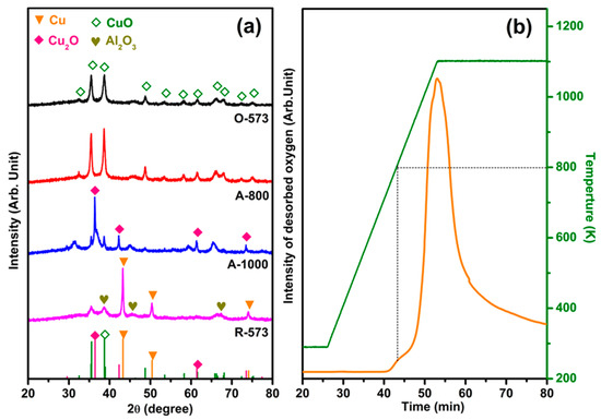 (a) XRD patterns of 50 wt% CuOx/Al2O3 after different in situ pretreatments (fully oxidized (O-573), 800 K annealed (A-800), 1000 K annealed (A-1000), and fully reduced (R-573)). (b) Oxygen desorption profile during vacuum annealing of O-573, with a ramping rate of 30 K/min.
