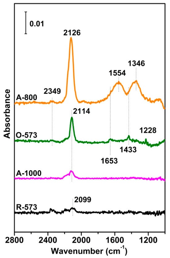 Transmitted IR spectra of R−573, A−1000, O−573, and A−800 exposed to 0.4 mbar CO at room temperature (RT). For all the measurements, reference spectra were taken on the sample before CO exposure.