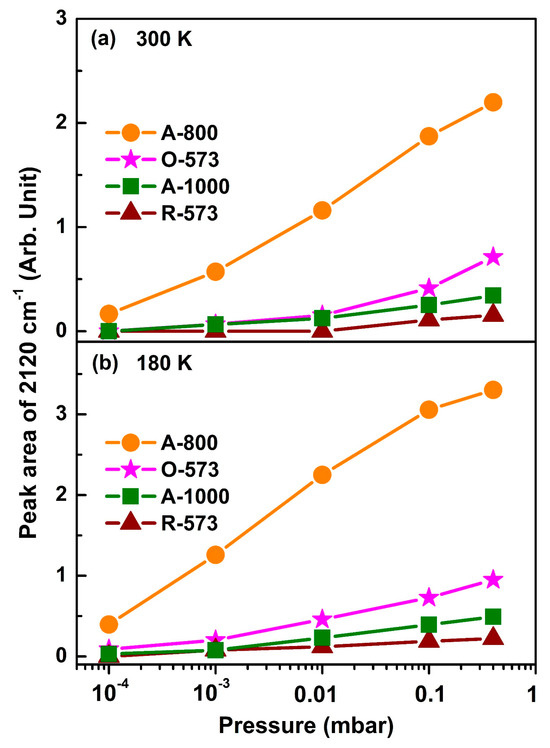 Plots of the integrated peak area of the CO vibrational band at 2120 cm−1 recorded at (a) 300 K and (b) 180 K as a function of CO pressure.