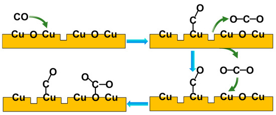 The proposed model of CO adsorption on CuO in the presence of oxygen vacancies. The blue arrows represent the order of the reaction and the green arrows represent the reactant and product involved in the reaction.