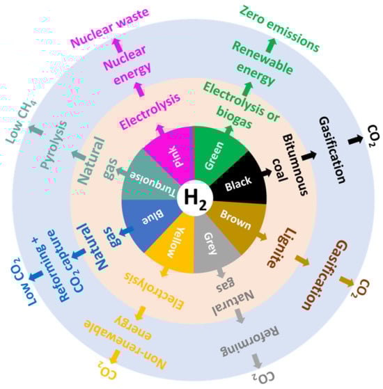 However, the quality of hydrogen production depends on different factors, such as the kind of source, process, and further treatments to obtain high-purity hydrogen. In this regard, hydrogen can be classified by colors, according to the cleanliness of the whole production [15], as observed in Figure 1.