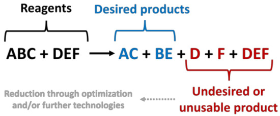 For this purpose, there are plenty of methods to determine the suitability of a process, especially at an industrial scale, from an environmental point of view [20,21]. This is a very interesting point, as there are countless research works including emerging green technologies, which should be proven at the industrial scale in terms of efficiency and sustainability. This approval is an essential step for green technologies to compete with traditional industries, especially those based on petrol. In this sense, there are several tools or indicators to assess the environmental impact of a certain industry or process. For instance, the carbon footprint is an interesting indicator that assesses the global greenhouse gas emissions related to an industry or activity. It should be noted that these emissions can be directly or indirectly generated, and it can be considered a part of LCA, as it is usually included in these kinds of assessments. Another interesting indicator is atom economy, whose main philosophy is indicated in Figure 2.