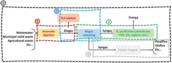 - In this way, Figure 4 points out different boundaries, like Boundary 1, which includes all the aspects related to the possible use of biogas, apart from biogas reforming. Obviously, this one would be the most complex LCA, but it could also be the most complete one to consider the global environmental impact of the process. Boundary 2 shows aspects related to anaerobic digestion, including the selection and pre-treatment of wastes, the possibility of co-digestion, and the possibility of biogas purification by removing H2S, among others. Boundaries 3 and 4 cover biogas reforming from different perspectives, with the different possibilities explained in this work and product purification (normally biogas, a combination of hydrogen and carbon monoxide). Finally, Boundary 5 shows a possibility to upgrade biogas through the Fischer–Tropsch process to produce different waxes and biofuels.