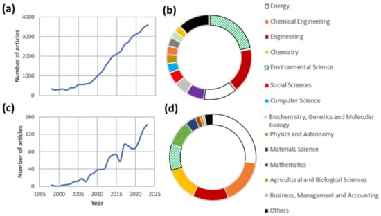 Published work evolution and research field distribution about LCA (a,b, respectively) and biogas reforming (c,d, respectively) between 1998 and 2023. Source: [55].