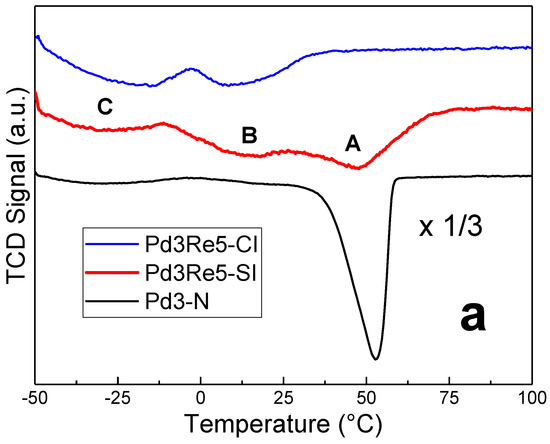 The TPHD spectra of the PdRe/Al2O3 catalysts prepared using the N precursor (Figure 2a) show a strong suppression of Peak A (when compared to Pd3-N) and the appearance Peaks B and C at approximately 15 and −25 °C, respectively. The H2 evolution at these low temperatures evidences the decomposition of less stable hydrides, e.g., those associated with Pd-Re alloy or bimetallic nanoparticles. For Pd3Re5-SI (prepared by impregnating a reduced Pd3-N catalyst with HReO4), Peak A is strongly suppressed but not completely eliminated, indicating that some unalloyed Pd particles remain in this catalyst; however, the ~2/3 reduction in the H/Pd ratio (Peak A) indicates that these are a minority. In contrast, Peak A is entirely eliminated in the TPHD spectrum of Pd3Re5-CI, leaving only Peaks B and C, which we infer are associated with Pd-Re alloy nanoparticles with different compositions. Thus, co-impregnation provides for better intermixing of Pd and Re in this catalyst; however, the alloy particles are relatively large, consistent with the pulse CO chemisorption data and as seen previously in HAADF-STEM images [10].
