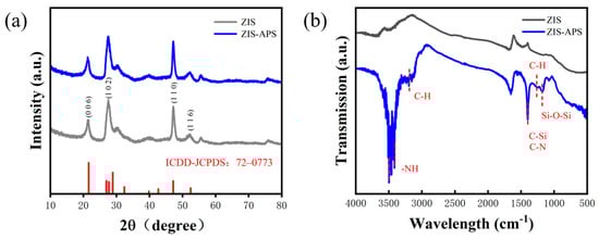 XRD patterns of ZIS and ZIS-APS (a) and FTIR spectra of ZIS and ZIS-APS (b).