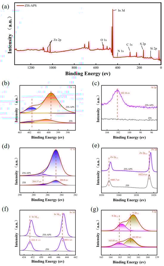 The surface composition and element valence states were further investigated via XPS (Figure 3). XPS survey scans (Figure 3a) revealed that In, S, Zn, N, Si, O, and C coexisted in the samples. Figure 3e–g show the specific XPS spectra of Zn 2p, In 3d, and S 2p for the prepared ZnIn2S4 and modified ZnIn2S4. The difference in binding energies between Zn 2p1/2 and 2p3/2 was approximately 23.1 eV, suggesting a typical Zn2+ in ZnIn2S4 [38,39]. The In 3d spectrum exhibited two peaks at 445.1 eV and 452.6 eV, which were attributed to the In 3d5/2 and In 3d3/2 energy levels, respectively. The S 2p peaks were located at 161.85 eV and 163.05 eV, corresponding to S 2p3/2 and S 2p1/2, respectively. The above XPS binding energies confirmed that the chemical valence states of In and S were In3+ and S2−. Affected by APS bonding, the Zn 2p, In 3d, and S 2p peaks in ZIS-APS shifted in the lower energy direction. The Si 2p peak in Figure 3c and the significantly enhanced C 1 s peak in Figure 3d further demonstrated the introduction of APS. The two N 1 s peaks at 399.7 and 401.7 eV (Figure 3b) were found in the high-resolution N 1 s spectrum, corresponding to the N–H orbitals of the primary amine and protonated amine NH3+, respectively. This indicates that the amine groups introduced by silane surface modification enhanced the adsorption of H+ in water, which is beneficial for improving the photocatalytic performance. The above results are consistent with the previous SEM and FTIR results, indicating the successful modification of ZIS with APS.