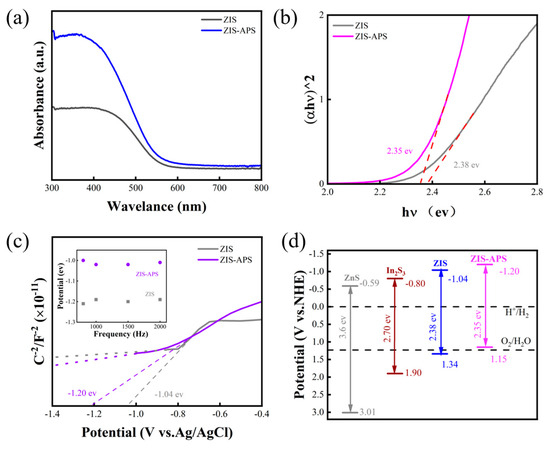 Optical properties of ZIS and ZIS-APS. UV–vis DRS spectra (a), Tauc energy band gap (b), MS plots, the inset shows the flat band potential at different frequencies (c) and band structure alignments (d). The band potentials for In2S3 and ZnS were obtained from Refs. [40,41].
