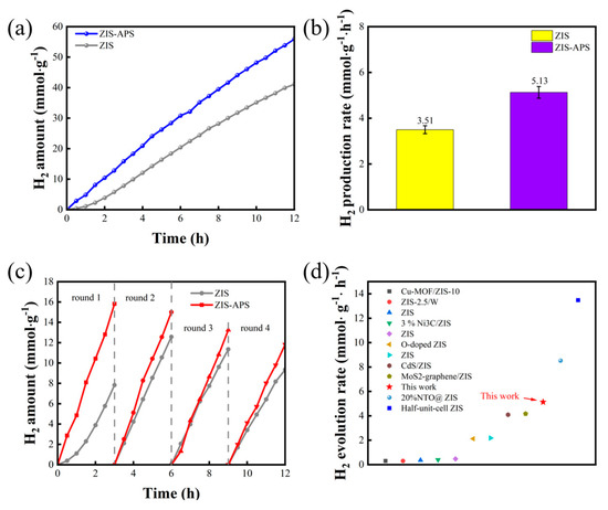 Xenon lamps provide simulated natural light illumination, and photocatalytic hydrogen production testing was conducted by combining a photocatalytic cycling instrument with gas chromatography. The changes in photocatalytic hydrogen evolution over time for ZIS and ZIS-APS are shown in Figure 5. The amount of hydrogen produced increased linearly with time, and the hydrogen production rates of the amine-modified ZIS were substantially greater than those of pure ZIS. Pure ZIS exhibited a photocatalytic hydrogen production rate of 3.51 mmol∙g−1∙h−1, whereas the rate of H2 evolution of ZIS-APS reached 5.13 mmol∙g−1∙h−1, which was 1.46 times greater than that of pure ZIS. The cyclic test results in Figure 5c show that the ZIS-APS photocatalyst maintained a relatively stable hydrogen production ability without any substantial decrease after four cycles for 12 h, with a 75.14% initial hydrogen production rate. ZIS had a lower hydrogen production rate in the first round, reached its peak in the second round, and then decreased. However, the hydrogen production rate remained lower than that of ZIS-APS throughout the four rounds. Compared with data reported in other studies (Figure 5d, some of the data were obtained under visible light), the hydrogen production rate of ZIS-APS was further ahead, and it had excellent stability.