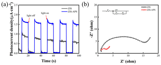 To further explore the carrier separation and migration efficiency, the photocurrent and electrochemical impedance spectroscopy (EIS) results of ZIS and ZIS-APS were obtained via an electrochemical workstation, and the results are shown in Figure 6. Figure 6a shows the time-dependent photocurrent measurements. ZIS-APS exhibited a higher photocurrent density that correlated well with the on/off cycle of simulated sunlight, indicating that the covalently modified amino molecules increased light absorption and facilitated efficient electron–hole pair separation. The facilitated charge transfer of ZIS-APS was further confirmed by EIS (Figure 6b). Compared with pure ZIS, ZIS-APS had a smaller arc radius (the Rct values of ZIS and ZIS-APS were 10 Ω and 0.84 Ω, respectively), which indicates that surface modification of ZIS with amino silane can substantially accelerate the charge transfer of ZIS. These electron transfers generally help separate photogenerated electron–hole pairs and consequently result in higher catalytic performance than that of pure ZnIn2S4.