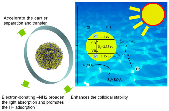 Figure 7 shows a schematic diagram of the increased photocatalytic hydrogen production mechanism. During the surface modification process, silane is first hydrolyzed into silanol and then condensed with the –OH groups on the ZIS surface. First, the long-chain alkyl groups introduced by surface modification enhance the colloidal stability of the ZIS suspension. Second, electron-donating amino groups participate in band gap regulation, improving light absorption and promoting the migration and separation of photogenerated carriers. Furthermore, the –NH2 groups on the surface of ZIS are positively charged owing to protonation, which promotes the adsorption of H+ on the ZIS surface. Therefore, the photocatalytic performance and stability of ZnIn2S4 were significantly improved. This is consistent with the previous UV–vis absorption, photocurrent, and impedance results.