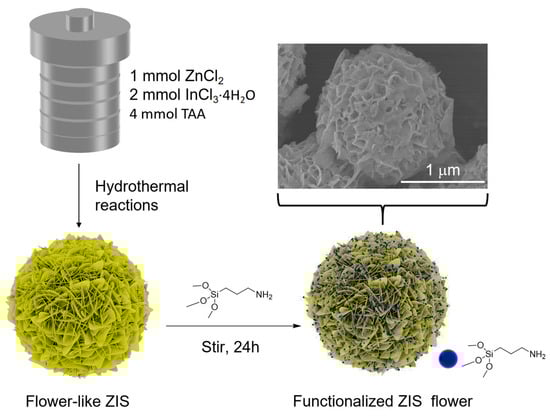 ZnIn2S4 (ZIS) has attracted great interest because of its suitable band gap, good chemical stability, simple and flexible preparation methods, and excellent light absorption. However, as a photocatalyst, its lower photogenerated carrier separation and migration efficiency, sluggish surface reaction kinetics, and high degree of photocorrosion severely restricts its photocatalytic activity [26,27,28]. Therefore, several strategies have been used to improve the photocatalytic performance of ZnIn2S4, such as morphology regulation, vacancy engineering, compounding with semiconductors, element doping, and the construction of heterojunctions [29,30,31,32]. Among them, constructing heterojunctions can effectively enhance the separation of photogenerated carriers and suppress photocorrosion. The use of multidimensional hierarchical hollow Co3O4/ZnIn2S4 tubular core–shell heterostructures resulted in a photocatalytic hydrogen production rate of 3844.12 μmol·g−1·h−1, which is 4.67 times greater than that achieved with pure ZnIn2S4 [33]. The ZIS-PyP S-scheme photocatalyst has a photocatalytic H2 evolution rate of 54 μmol·h−1, which is 2.5-fold greater than that of pure ZnIn2S4 [34]. However, the formation of high-quality heterojunctions requires precise control of the interfaces and optimization of the band alignment. In addition, there is still controversy over the migration direction of photogenerated carriers in direct Z-scheme heterojunctions [35]. Compared with constructing heterojunctions, surface modification with organic small molecules is relatively simpler and more effective. Herein, ZnIn2S4 was synthesized via a hydrothermal reaction method, followed by surface modification with 3-aminopropylmethoxysilane (APS). The purpose of surface modification is as follows: first, the band gap of ZnIn2S4 is regulated through the participation of electron-donating amino groups of APS, increasing light absorption and accelerating the separation and migration of photogenerated carriers; second, the colloidal stability of the ZnIn2S4 suspension through the spatial hindrance provided by APS, along with the increased adsorption of H+ by amino groups, synergistically improves the photocatalytic hydrogen production rate of ZnIn2S4.