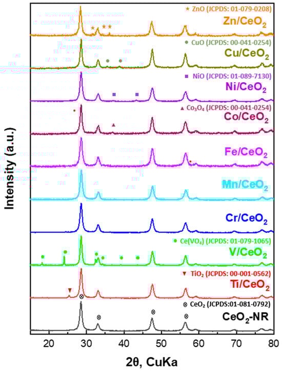 XRD patterns of bare CeO2-NR and TM/CeO2 samples are presented in Figure 1. The main diffraction peaks of bare CeO2 correspond to the following planes: (111), (200), (220), (311), (222), (400), (331), and (420) and are attributed to the face-centered cubic (fcc) fluorite structure of ceria (Fm3m symmetry, no. 225) [,]. Furthermore, in the case of TM/CeO2 samples (M: Ti, Fe, Co, Ni, Cu, and Zn), smaller peaks of their corresponding oxides are detected, demonstrating the existence of TiO2, Fe2O3, Co3O4, NiO, CuO, and ZnO, respectively, with no other crystal phases existing, apart from ceria. In contrast, Mn/CeO2 and Cr/CeO2 samples do not present any diffraction peaks, except from the ceria crystal phase, a fact that can be attributed to the low metal loadings in conjunction with the high metal dispersion, rendering the calculation of their crystallite sizes impossible. In the XRD pattern of V/CeO2, apart from ceria characteristic peaks, a series of XRD peaks located at 2θ values around 18.2°, 24.0°, 32.4°, 34.2°, 39.0°, 43.5°, 46.4°, 47.9°, 49.2°, 55.5°, and 60.2° were observed, which are related to the (101), (200), (112), (220), (301), (103), (321), (312), (400), (420) and (332) planes of CeVO4 [,], respectively. Therefore, it is evident that in the case of V/CeO2, a mixed crystal phase has been formed via the impregnation method, including CeO2 and CeVO4.