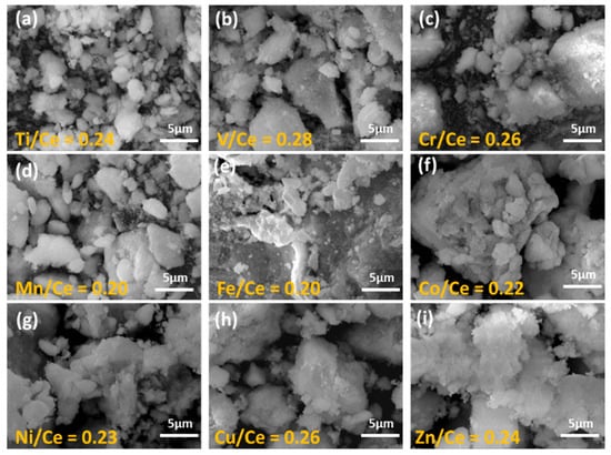 SEM images of the samples: (a) Ti/CeO2, (b) V/CeO2, (c) Cr/CeO2, (d) Mn/CeO2, (e) Fe/CeO2, (f) Co/CeO2, (g) Ni/CeO2, (h) Cu/CeO2 and (i) Zn/CeO2.