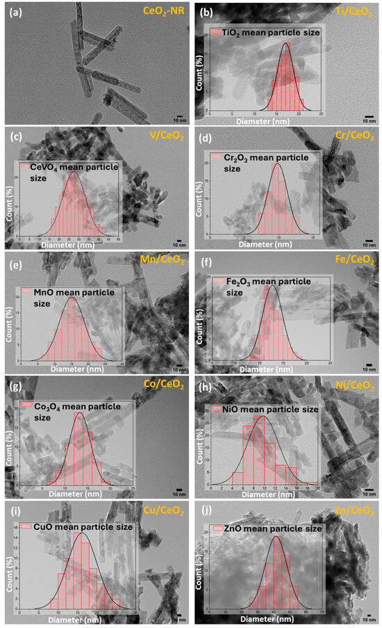 TEM images of the samples: (a) CeO2-NR, (b) Ti/CeO2, (c) V/CeO2, (d) Cr/CeO2, (e) Mn/CeO2, (f) Fe/CeO2, (g) Co/CeO2, (h) Ni/CeO2, (i) Cu/CeO2 and (j) Zn/CeO2.