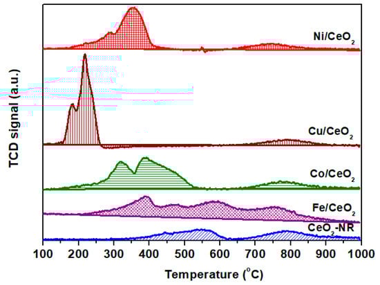 Furthermore, as depicted in Table 2, hydrogen consumption surpasses the theoretical amount for all TM/CeO2 samples, apart from the Fe/CeO2 sample, revealing that the addition of the metallic phase enhances the reducibility of ceria nanorods, due to synergistic metal–support interactions.