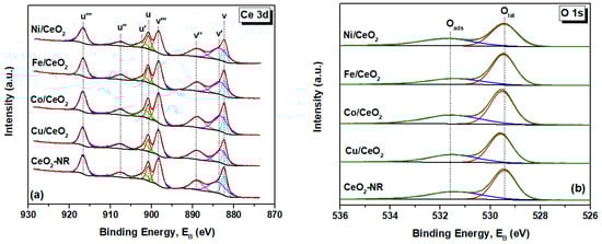 In order to assess the impact of surface chemistry on the intrinsic properties and catalytic performance, XPS analysis was conducted over the optimum catalytic materials (TM/CeO2, TM: Fe, Cu, Co, Ni) in their reduced states. In Figure 5a, the Ce 3d XPS spectra are depicted with the Ce 3d3/2 and Ce 3d5/2 states corresponding to the u and v lines, respectively. The three pairs of peaks u (902.1 eV), u″ (908.5 eV), u‴ (917.3 eV) and v (883.2 eV), v″ (889.8 eV), v‴ (899.5 eV) characterize the Ce4+ species, while the u′ (904.7 eV) and v′ (886.2 eV) peaks are attributed to the Ce3+ species [,,].