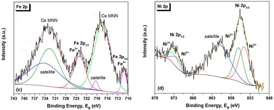 Figure 6a presents the Cu 2p XPS spectrum of the reduced Cu/CeO2 catalyst which includes two main peaks at 953.7 eV and 933.8 eV, ascribed to Cu 2p1/2 and Cu 2p3/2 states, respectively. The existence of satellite peaks at 943 and 962 eV confirms the presence of Cu2+ species [,]. The Co 2p XPS spectrum for the reduced Co/CeO2 sample (Figure 6b) exhibits two main peaks of Co 2p1/2 (796.6 eV) and Co 2p3/2 (780.6 eV), as well as shake-up satellites at 786 eV which are characteristics of Co2+ [,]. Moreover, Figure 6c depicts the Fe 2p XPS spectrum of the reduced Fe/CeO2 catalyst. There are two peaks at 711 and 724 eV, assigned to the Fe 2p3/2 and Fe 2p1/2, respectively, and two satellite peaks at 719 and 734 eV, designating the presence of Fe3+ [,]. The satellite peaks overlap with the Auger Ce MNN peaks. The formation of Fe2+ species results from the iron oxide–ceria interaction via an interfacial redox process: xFe2O3 + (2 − y)CeO2−x → xFe2O3 − y + (2 − y)CeO2 [,,]. In addition, Figure 6d illustrates the Ni 2p XPS spectrum of the reduced Ni/CeO2 sample, with two peaks at 855 eV (Ni 2p3/2) and at 873 eV (Ni 2p1/2), along with a broad satellite peak at 861 eV, associated with the presence of Ni3+ species (Ni2O3) [,]. According to the XPS results of the reduced catalysts, metal species exist in different oxidation states which can be related to the strength of the metal–support interactions, as indicated in the literature [,]. Nevertheless, the difficulty in establishing reliable relationships between metal oxidation states and catalytic performance should be underscored, on the ground of ex situ nature of XPS in conjunction with different metal entities employed as active phases in the present work.