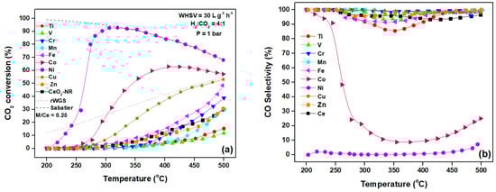 Comparative assessment of (a) CO2 conversion and (b) selectivity to CO for the first-row 3d transition metals supported on CeO2 nanorods. Reaction conditions: WHSV = 30 L·g−1·h−1, H2:CO2 = 4, P = 1 bar.
