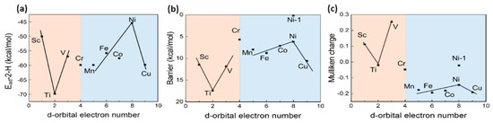 It is evident that there is a volcano-type dependence of barrier energy in relation to the number of 3d-orbital electrons, with Ni located at the peak with the lowest energy. This implies the superiority of Ni for CO2 hydrogenation among the other 3d metals. Moreover, the change in charge from IS (initial state) to TS (transition states) on adsorbed CO2 also exhibits a volcano-shaped relationship in agreement with the barrier energy, confirming that the barrier energy is closely correlated to electron transfer. Besides, the adsorption energy of H atoms is perfectly correlated with the barrier energy of CO2 hydrogenation, being again the lowest for Ni [].