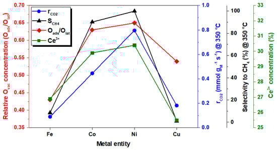 where Ce(III) and Ce(IV) denote the corresponding sums of the integrated peak areas associated with the Ce3+ and Ce4+ XPS signals, respectively (Table 3). Ni catalyst exhibits the highest amount of Ce3+ species (30.4%), followed by Co (29.9%), Fe (26.9%) and Cu (25.5%). The significant role of Ce3+ species in the CO2 hydrogenation process (activation of CO2 and formation of active intermediates) has been revealed in the literature [,,], with these sites being associated with the abundance of oxygen vacancies and the extent of metal–support interactions []. Cao et al. [] demonstrated a volcano-type curve between activity and surface Ce3+ fractions for CO2 hydrogenation to CO over ceria catalysts. Moreover, under CO2 hydrogenation reaction conditions, a Ni catalyst supported on mesoporous ceria nanofiber assembly was found to lead to the formation of active Ce3+ sites located at the interface, thus boosting the catalytic performance and promoting the formate pathways [].