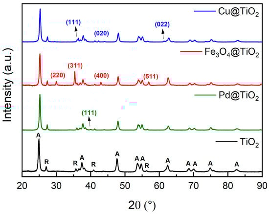 X-ray diffraction (XRD) helped us to acquire insights into the crystalline structures of the synthesized materials. For our tests, P25 was the source of titanium dioxide. P25 is formed from TiO2 nanoparticles, with a diameter between 10 and 50 nm (Figure 1A), composed of 80% anatase and 20% rutile phase []. The diffractogram of P25 (Figure 2) confirms its crystalline structure. Peaks assigned for anatase and rutile are identified as A and R, respectively, according to ICCD cards n° 01-083-5916 and 01-076-1940. In the diffractogram, for all the metal-loaded TiO2 catalysts the same peaks assigned to TiO2 (P25) can be identified (Figure 2). From the diffractogram of Cu@TiO2, we identified the structure of Cuprite (Cu2O) (ICCD: 96-900-7498), a cubic-shaped crystal formed from the oxidation of Cu0. The diffractogram peaks assigned to Cu2O can be found at 2θ values 36.4°, 42.3°, and 61.4°, relative to the crystal planes (111), (020), and (022), respectively.