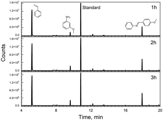 Chromatograms showing the peaks obtained after performing the reaction with 3-nitroanisole 0.1 M in benzyl alcohol and 10 mg of Fe3O4@TiO2. We irradiated 5 mL of the solution for 3 h under UVA irradiation and continuous stirring. Samples were taken every hour and filtered using a PTFE syringe filter. 3,5-Di-tert-butyltoluene was used as an external standard (peak at 10.84 min) The products had the following retention times: BenzA—5.17 min, m-anisidine—9.63 min, Schiff base N-(4-Methoxybenzylidene)aniline—17.94 min. The timed events feature of the local user interface was used (turned off at 6.20 min and activated at 8.70 min) to prevent the risk of a high concentration of benzyl alcohol reaching the detector.