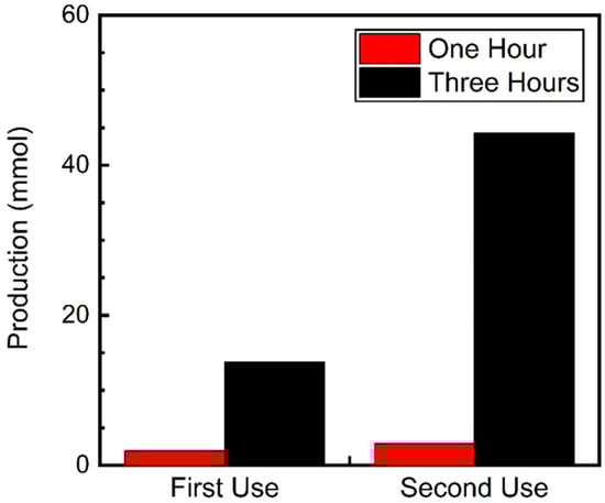 We also investigated whether the catalytic delay persisted during a second use of the catalyst. To test this, a reaction for 3 h under UVA irradiation was conducted. After this period, 0.1 M of fresh nitrobenzene was added to the solution, which would avoid wasting the excess benzyl alcohol and the produced BenzA. The reaction was then irradiated for another three hours. Figure 5 compares the results from the first and second uses of the catalyst difference between the first use of the catalyst. During the first use, Fe3O4@TiO2 produced 13.8 mmol of N-benzylamine after three hours. However, during the second use, the catalyst yielded over 44.3 mmol of the desired Schiff base in the same time frame.
