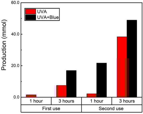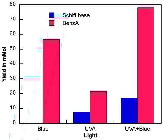 When both wavelengths of irradiation are used, the BenzA production increases significantly. Given that BenzA is a crucial intermediate for synthesizing the desired Schiff base, combining both irradiation methods leverages the benefits of blue light for higher BenzA production and the nitro reduction and condensation steps facilitated by UVA irradiation. The results of this experiment are presented in Figure 6, showing the Schiff base production (blue) and BenzA concentration (red) after 3 h of irradiation. Notably, the production of the carbonyl intermediate increased with dual-wavelength irradiation, reaching 77.9 mmol. Even more interestingly, the dual irradiation more than doubled the production of the Schiff base, increasing from 7.5 mmol to 17 mmol, clearly demonstrating that, the dual excitation effect leads to a more effective activation of the hybrid catalyst.