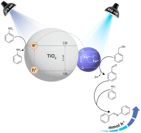 In this report, we have studied several catalysts, but quickly center on Fe3O4@TiO2, a magnetic photocatalyst that has proven extremely useful, allowing us to start the synthesis of Schiff bases from readily available alcohols and nitro compounds, rather than the conventional carbonyls and amines of Scheme 1. We aimed at producing a hybrid material capable of catalyzing both oxidations and reductions. In fact, over a century ago [,], Sabatier recognized that hydrogenation catalysts that could work with sacrificial hydrogen donors necessarily had to also be good oxidation (or dehydrogenation) catalysts. In our case, Fe3O4@TiO2 can perform both functions—reduction for the nitro compound and oxidation for the alcohol, thus generating both reaction partners in situ. While irradiation in the UVA region can photocatalyze the complete process, we have discovered that two-color irradiation can dramatically accelerate the process, as blue light, selectively absorbed by magnetite, can convert alcohols to aldehydes or ketones. While no Schiff bases are formed with just blue light, when combined with UVA, the result is a dramatic enhancement of the catalyst’s performance, which is the central piece of this work. As such, the color-coordinated catalysis of Schiff base formation provides another example where two-color photochemistry [] contributes to the goals of sustainable chemistry [].