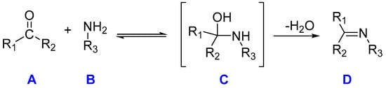 Thermal Schiff base synthesis. Molecule A corresponds to a ketone, molecule B corresponds to an amine compound, molecule C is the hemiaminal (an intermediate compound), and molecule D is the Schiff base, characterized by the distinctive double bond C=N.