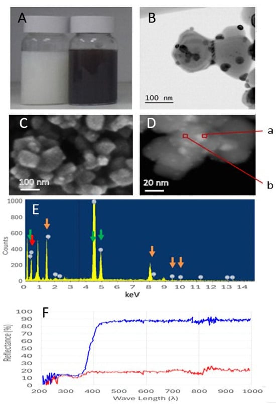 Structural characteristics of TiO2-Pt microparticles. (A)—Visual appearance of microparticle suspensions of TiO2 (left) and TiO2-Pt (right). (B)—TEM micrograph; the Pt clusters are black. (C)—HRSEM micrographs of TiO2-Pt microparticles. (D)—Enlargement of (C). The Pt clusters on the TiO2-Pt surface are white. (E)—EDS spectrum of point “a” in plate (D). The green arrows are Ti, the orange ones are Pt, and the red one is O. (F)—Reflectance spectra of TiO2 (blue) and TiO2-Pt (red) microparticles; the black TiO2-Pt microparticles fail to reflect light.