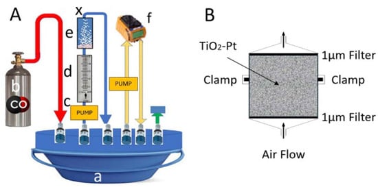Two models were investigated: one involved the removal of CO from a CO-polluted closed environment (the environmental model), and the other concerned an application for personal protection (the mask model). We have shown that TiO2-Pt is efficient in CO removal. The catalytic efficiency increased with catalyst mass but was limited by the flow rate, as CO oxidation required a minimal residence time (Table 3) of the gas in the reactor. To enable a higher flow rate through the system, several reactors were used in parallel, as described in Figure 5B.