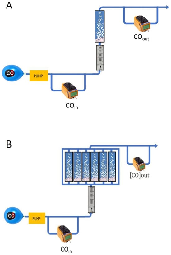 The linear system for CO oxidation. The source for CO (blue balloon) is a 20–80 L aluminum inflatable balloon, containing CO at certain concentrations. COin and COout were monitored in parallel streams to avoid interference of the detectors’ pumps with the general flow rate. (A)—A uni-cell unit. (B)—A multi-cell unit.