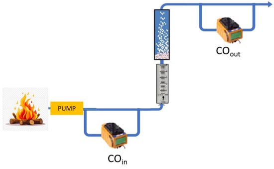 The environmental model (Figure 2) consisted of a 20 L container filled with air containing CO at a certain concentration (usually 400–1000 ppm). A closed flow system circulates the CO-containing air through a reaction cell, where CO levels are continuously monitored. At a certain amount of catalyst and under certain conditions, the catalytic oxidation of CO was expected to be a first-order reaction:
