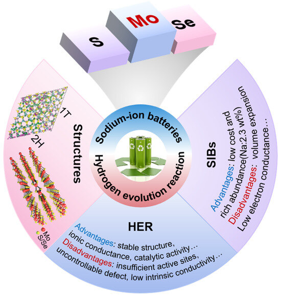 This work focuses on MoS2 and MoSe2, two layered TMDs that are important for SIBs and HER applications, as shown in Figure 1. The development of these materials’ applications and structural innovations have received a lot of attention in recent years. Their unique physicochemical properties endow them with strong potential as bifunctional electrode materials for energy storage and conversion. However, limitations such as insufficient active sites and suboptimal electronic conductivity hinder their widespread application. This review will cover recent advances in modifying the electronic structure of MoS2/MoSe2 using environmentally friendly biomass-derived carbon materials. This approach aims to enhance the suitability of these materials as electrode components for efficient sodium-ion battery charge–discharge cycles and sustained hydrogen evolution. The review will discuss the sources and classifications of biomass-derived carbon (BMC), specific methods for tuning the electronic structure of MoS2/MoSe2, and the underlying mechanisms. The insights provided here will contribute to the development and application of BMC/Mo-based sulfides/selenides in SIBs and the HER.