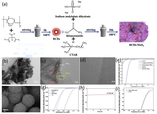 (a) A schematic illustration of the synthesis of BCDs-MoS2; (b–d) TEM images of BCDs-MoS2; (e) LSV curves of BCDs-MoS2 and compared samples for the HER. (a–e) Reproduced with permission from from [89], Copyright 2022, Elsevier. (f) SEM image of MoS2@Pt/YC; (g) ECSA-normalized current densities of YC, MoS2@YC, Pt/YC, and MoS2@Pt/YC. (h) The time dependence of the current density for MoS2@Pt/YC in H2SO4 (0.5 M). (i) Polarization curves of MoS2@Pt/YC before and after 3000 CV cycles. (f–i) Reproduced with permission from from [90], Copyright 2022, ACS.
