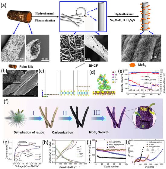 Because of their large theoretical capacity, two-dimensional MoS2 sheets are widely employed as anode materials for lithium- and sodium-ion batteries (LIBs and SIBs). However, the rate performance and lifetime of the electrodes are negatively impacted by their low conductivity and notable volume variations during cycling [105]. To address these issues, Liu et al. prepared MoS2@biohybrid carbon nanofibers (MoS2@BHCF) by in situ hydrothermal and thermal treatments of palm silk biomass (Figure 6a) [106]. The MoS2@BHCF composite has thinner and smaller nanosheets developing on the BHCF scaffold, as seen in Figure 6b. Figure 6c shows the optimal architectures of MoS2, carbon, and MoS2/C hybrids stacked horizontally. The extraordinarily high formation energy (Ef) of 5.87 eV per MoS2 implies that this growth mechanism is thermodynamically unfavorable, even though the horizontally developed MoS2 structures on the carbon surface are thermodynamically stable at 0 K. In contrast, MoS2 can grow vertically on the carbon surface, minimizing the formation energy (Figure 6d). MoS2@BHCF, with its optimized electronic structure, shows significantly enhanced performance as an anode material for SIBs, as demonstrated by rate performance tests (Figure 6e). Additionally, Ding’s research group used dehydrated raupo to produce carbonized amorphous micron-sized carbon ribbons (AMCRs) and subsequently loaded MoS2 onto them (Figure 6f) [107]. They conducted comprehensive electrochemical testing of the MoS2@AMCRs composite, including cyclic voltammetry (CV), galvanostatic charge–discharge (GCD), cycling stability, and impedance measurements, to validate the enhancement of MoS2’s sodium storage performance due to the BMC (Figure 6g–j). Luo et al. and Xiao et al. also utilized BMC to modify the structure of MoS2, achieving enhanced Na⁺ storage performance [108,109]. During the sodium-ion intercalation process, composites with unique micro-/nanostructures can effectively buffer structural volume changes and provide additional energy storage sites, contributing to the stability and enhancement of electrochemical performance. In addition, stable interfaces prevent unwanted reactions that can form solid–electrolyte interphase (SEI) layers or other degradation products. A high-quality interface minimizes side reactions and prolongs battery life. Moreover, during the insertion and extraction of sodium ions, MoS2 undergoes significant volume changes. A well-designed interface can accommodate expansion and contraction without causing structural damage, improving cycling stability.