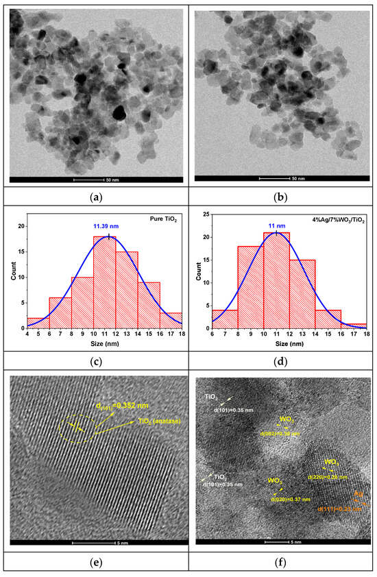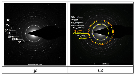 Figure 3a,b prove that pure TiO2 and 4%Ag/3%WO3/TiO2 exhibit a homogenous morphology, with a grain size within the approximate range of 10–15 nm. The average particle sizes for the pure TiO2 and its composite have been determined from the histograms in Figure 3c,d, which show particle size distributions of 11 nm and 11.39 nm for TiO2 and 4%Ag/3%WO3/TiO2, respectively. The HR images of the TiO2 and the composite, which are shown in Figure 3e–h, expose the presence of fringes that were identified by SAED pattern lattice spacing values of 0.352 nm corresponding to the lattice spacing values of the (101) plane of anatase TiO2, 0.38 nm that agrees with the (002) plane of monoclinic WO3, and 0.23 nm for the (111) plane; these values are in agreement with the XRD results and previous reports [34,35,36,37].