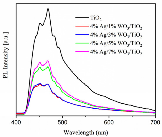 As shown in Figure 5b, the energy gap was reduced as a result of the WO3 particles being loaded onto the TiO2 surface, according to the data in Table 2. The increase in WO3 concentration on the surface of the TiO2 composite contributes to the decrease of the energy gap and, consequently, increases the conductivity of the prepared materials. PL was employed to investigate the impact of the increase in the WO3 ratio on the charge carrier trapping and transfer into the prepared composites. The emission spectra of pure TiO2 and 4% Ag/x%WO3/TiO2 (with x = 1, 3, 5, and 7 wt.% of WO3) nanocomposites are displayed in Figure 6. The prepared samples were excited at 380 nm to obtain the emission spectra and the result exhibited two luminescence emissions at 450 nm and 470 nm; according to the results, the emission peak at 450 nm was related to the surface defects. The composite and the analysis of the effectiveness of the charge carrier trapping and transfer through the knowledge of the bath of e−/h + pairs in semiconductors can be linked to particular electronic properties of the WO3–TiO2 nanocomposites [46]. However, the recombination of excited charge carriers on the WO3 surface is responsible for the emission peak at 467 nm [47]. The results reveal that the PL spectra were decreased with an increase in the WO3 weight ratio at 4% Ag/x%WO3/TiO2 (with x = 1, 3 wt.% of WO3) nanocomposites, which means that there is an increase in the lifetime of the electrons at the exited state that gives a high photonic efficiency and photocatalytic activity [48,49]. On the other hand, when the WO3 weight ratio increases to 5 and 7%, the impurity energy level works as a charge carrier recombination center, and the PL spectrum re-increases again, which decreases the photonic efficiency and photocatalytic activity [30,50].