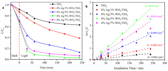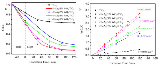 (a) Degradation curves of MB dye solution; (b) plots of ln (Co/C) versus irradiation time of pure TiO2 and 4% Ag/x%WO3/TiO2 (x = 1, 3, 5, and 7%) nanocomposites.